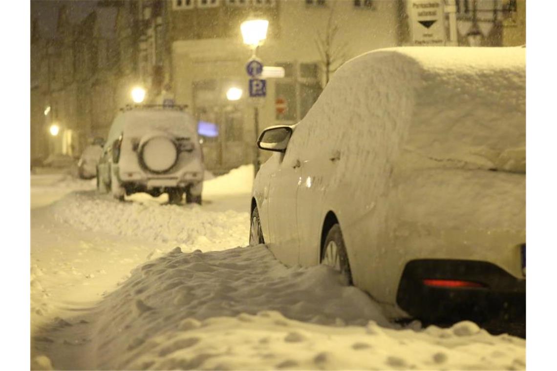 Schnee bedeckt am frühen Morgen eine Straße und die Autos am Straßenrand. Tief Tristan hat für gewaltige Schneemengen im Harz wie hier in Wernigerode gesorgt. Foto: Matthias Bein/dpa-Zentralbild/dpa