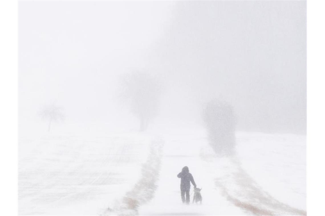Spaziergang bei Schneesturm: Dieser Mann führt seinen Hund im niedersächsischen Ingeln-Oesselse aus. Foto: Julian Stratenschulte/dpa