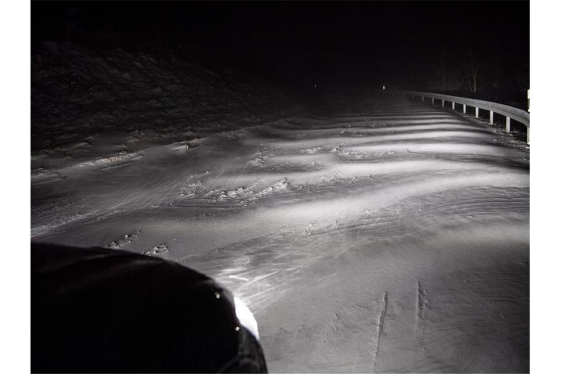 Zugeschneit: Ein Autoscheinwerfer leuchtet Schneeverwehungen auf einer Straße bei Detmold an. Foto: Lino Mirgeler/dpa