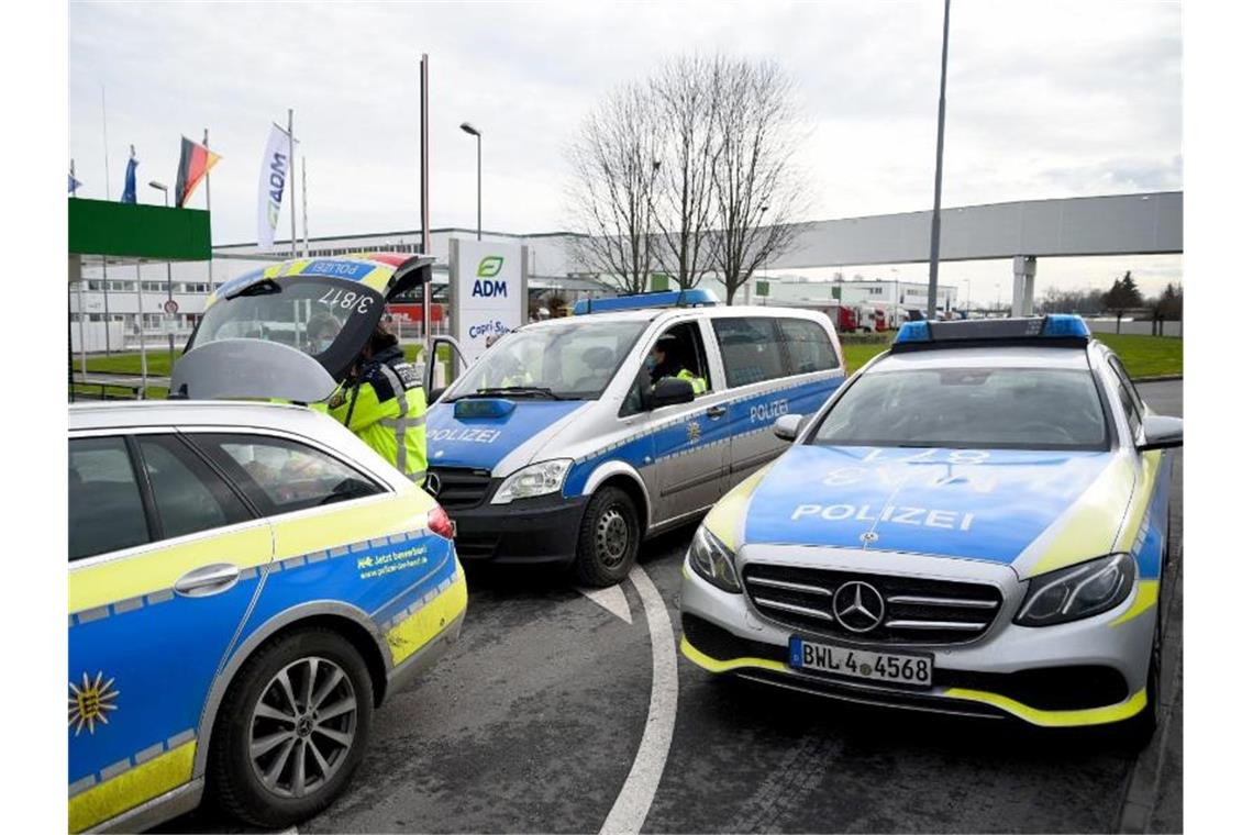 Fahrzeuge der Polizei stehen vor dem Werk eines Getränkeherstellers, wo eine Serie explosiver Postsendungen begannn. Jetzt wird wird einem 66-jährigen Elektriker der Prozess gemacht. Foto: Rene Priebe/dpa