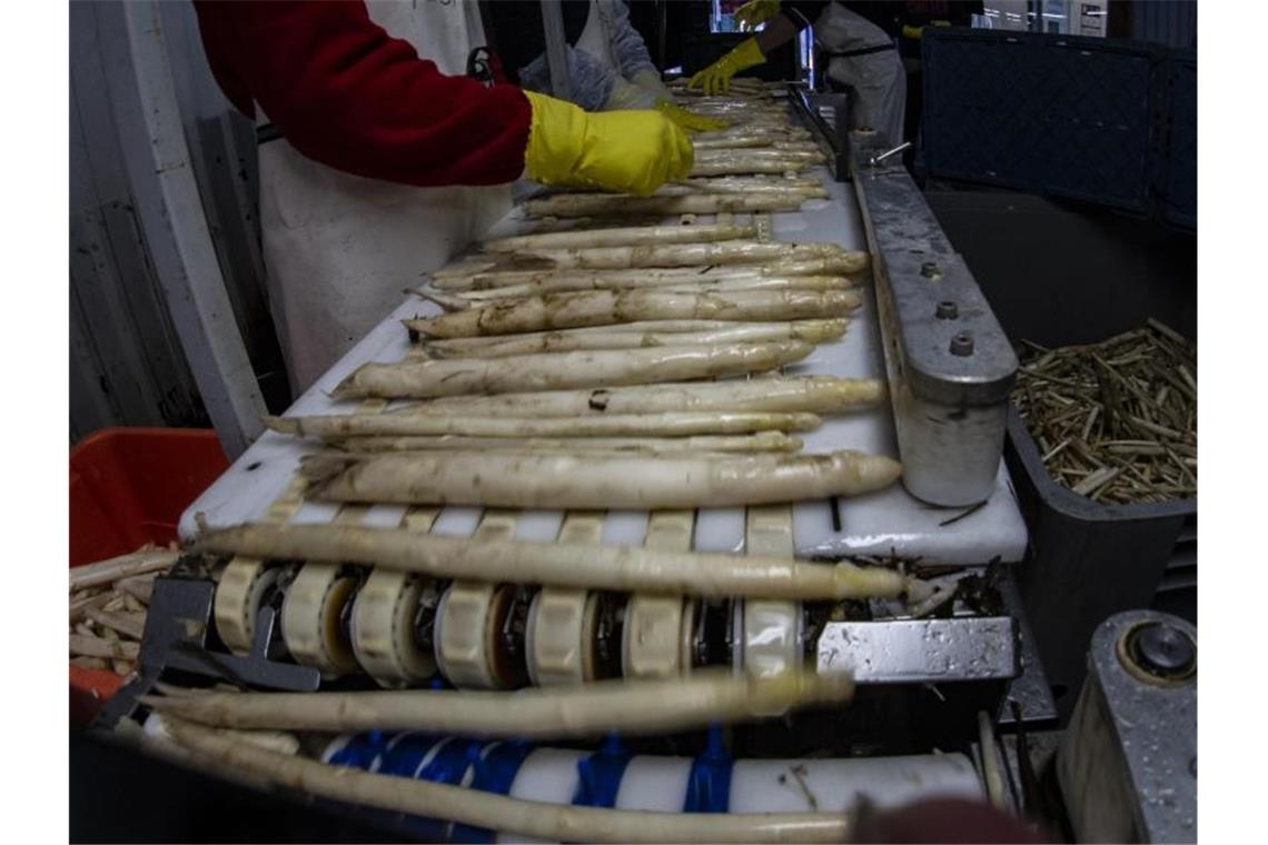 Arbeiter sortieren auf einem Spargelhof frisch gestochenen Spargel. Foto: Paul Zinken/dpa-Zentralbild/dpa/Archivbild