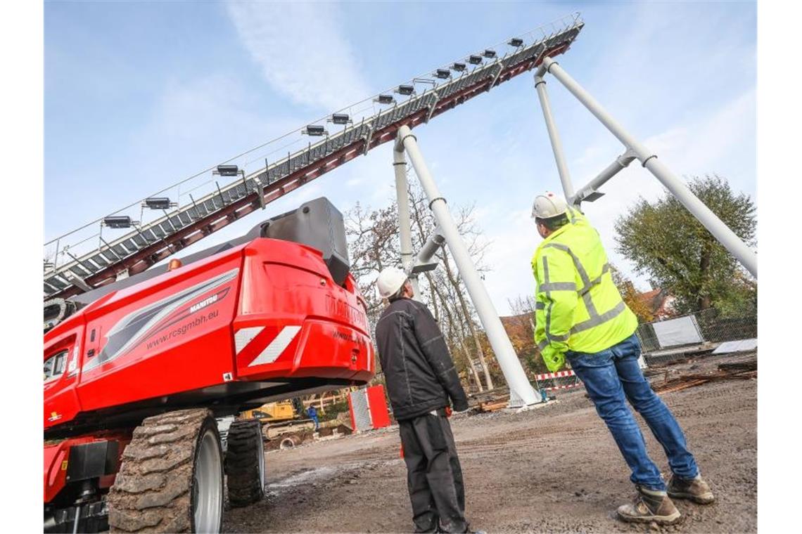 Mitarbeiter stehen auf der Baustelle des Freizeitparks Tripsdrill. Foto: Christoph Schmidt/dpa