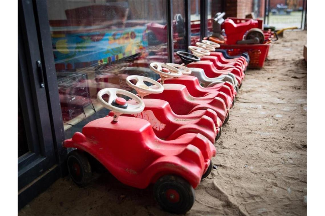 Mehrere Bobbycars stehen auf dem Spielplatz eines Kindergartens. Foto: Christian Charisius/dpa/Symbolbild