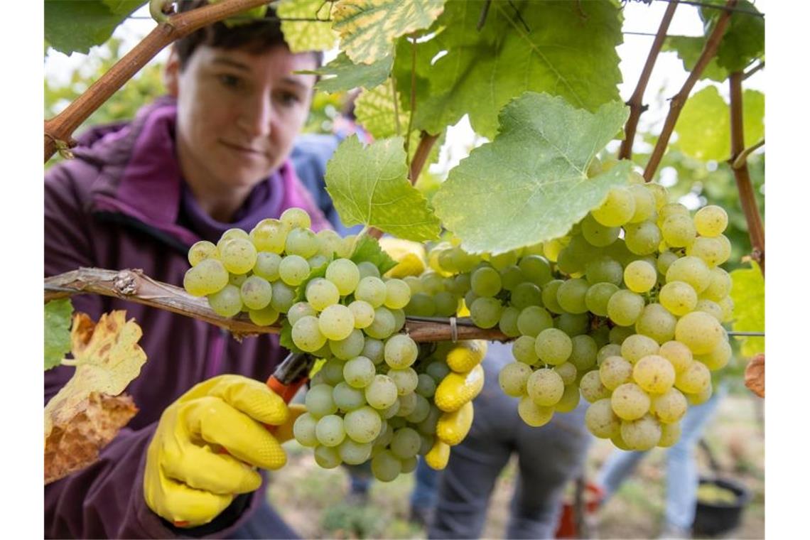 Alina Dereser, Winzerin, erntet im Weinberg im bayrischen Kolitzheim Trauben der Sorte Silvaner. Foto: Daniel Karmann/dpa