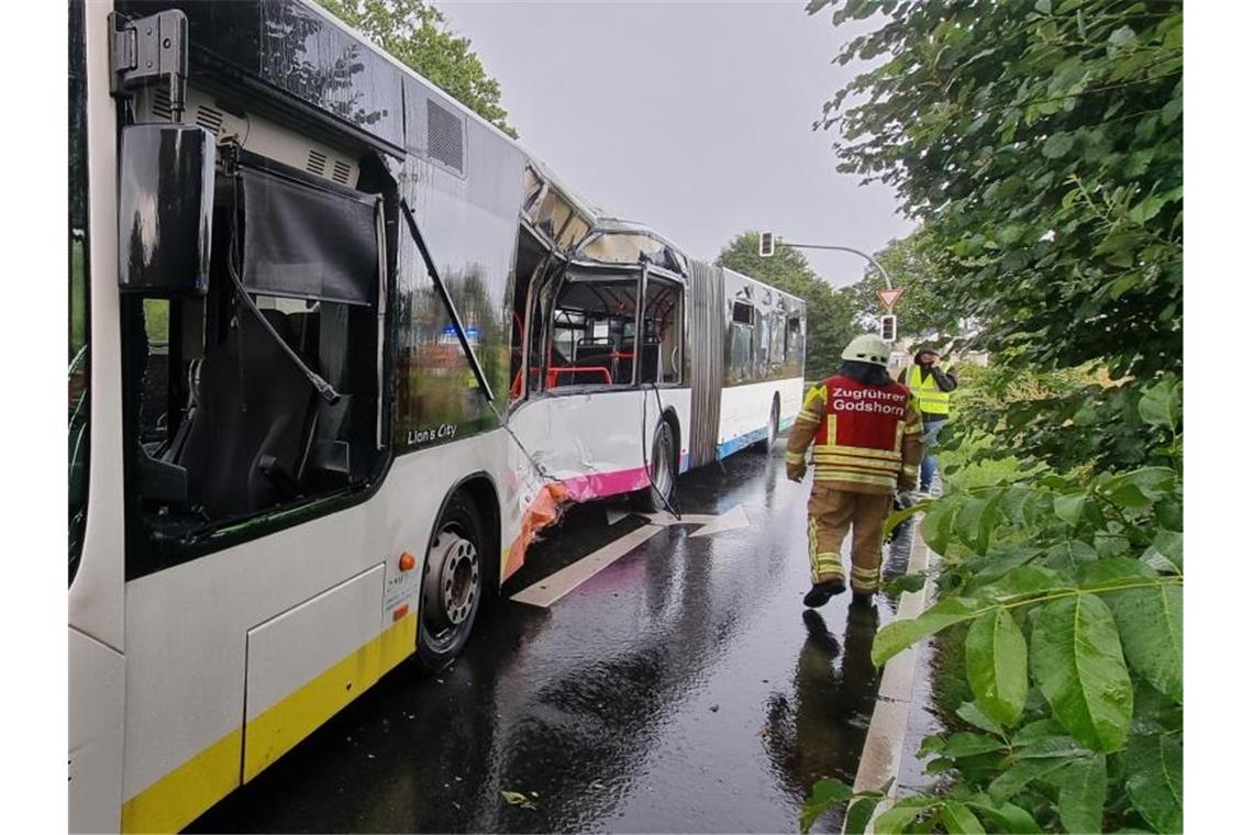 Der stark beschädigte Linienbus an der Unfallstelle in Langenhagen. Foto: -/TNN/dpa