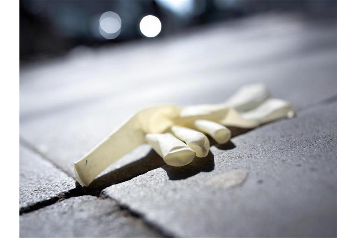 Eine weggeworfener Einweg-Schutzhandschuh auf einem Gehweg in Düsseldof. Foto: Martin Gerten/dpa