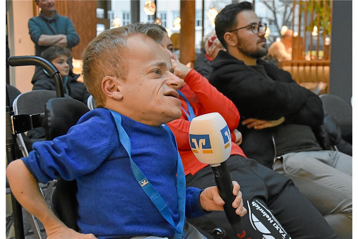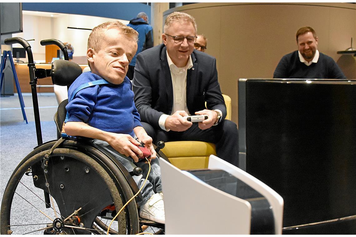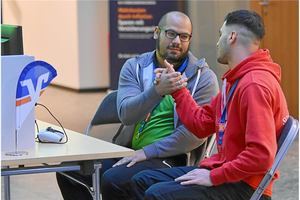 Er bestrafe jeden Fehler, analysiert Mert Tasdelen, „das schaffe ich nicht“. Weil der SG-Fußballer den Tipp beherzigt, lieber mal einen Trick weniger zu machen, bleibt die Niederlage mit dem 1:3 im Rahmen. Dasselbe Ergebnis trotzt Jürgen Schwab dem Könner ab, obwohl er anfangs gar nicht an die Konsole wollte. „Es war wirklich klasse“, erzählt der Vorstandsvorsitzende der Volksbank Backnang nach der Partie: „Es hat viel vom echten Fußball, erfordert hohe Konzentration und motorische Fähigkeiten.“ Er sei von Niklas Luginsland wohl gnädig behandelt worden, mutmaßt Schwab lachend, während ihm der Gegner viel Lob zollt: „Er hat es richtig gut gemacht, ohne Witz.“