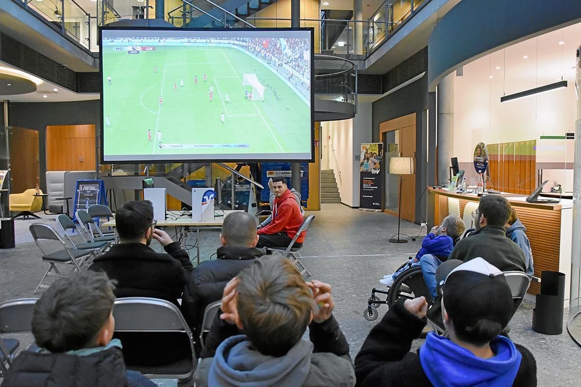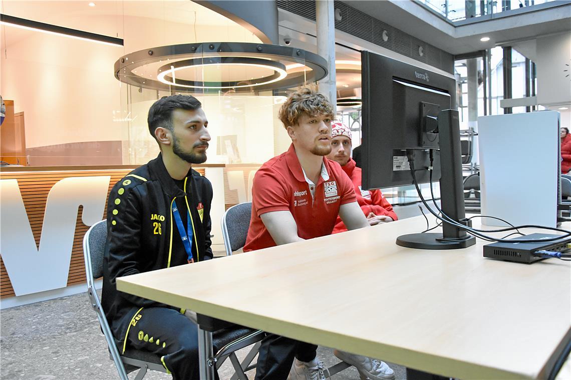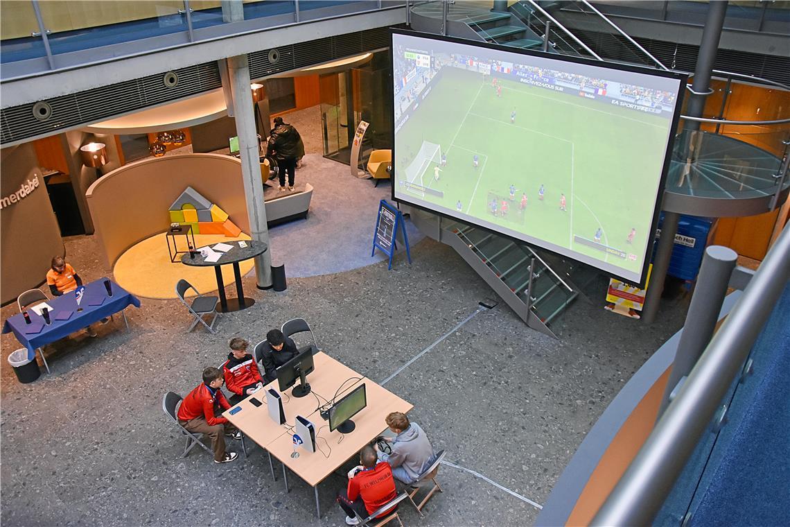 Der Schauplatz Es ist alles angerichtet, als die zehn Teams in der Hauptgeschäftsstelle der Volksbank Backnang eintreffen. Im Kundenraum des Kreditinstituts, das als Partner unserer Zeitung die Gastgeberrolle innehat, hängt eine stattliche Leinwand, auf der im Turnierverlauf immer eine Partie live zu sehen ist. Gezockt wird in der Vorrunde und im Viertelfinale aber parallel an zwei Spielstationen, die von den Fachleuten von Leno-E-Sports aufgebaut worden sind. Dessen Geschäftsführer Frank Fischer zeigt sich vom Austragungsort des Events begeistert, „das ist ein Highlight“. So sieht es auch der zu den Stars der E-Sport-Szene gehörende Niklas Luginsland, der sich auf einer dritten Konsole in der Sofa-Lounge mit allen misst, die ihn herausfordern wollen. Für ihn ist es auch deshalb eine „supercoole Location“, weil durch den offenen Zugang vom Café Wunderbar immer wieder neue Neugierige vom Turniergeschehen angelockt werden.
