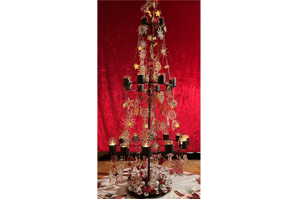 Kirchsaal im Staigacker: Dieser Baum ist so wunderschön gewachsen, dass seine natürliche Schönheit durch Strohsterne unterstrichen wird. Hier feiern wir mit unseren Heimbewohneren den Weihnachtsgottesdiens