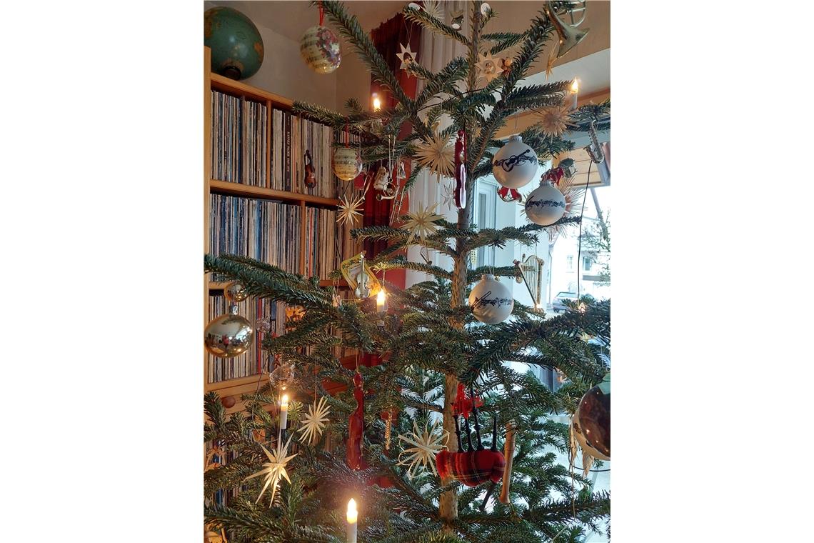 Wir haben unseren Baum im Trailhöfle gekauft. Da wir gerne Musik machen und hören, ist er mit vielen kleinen Musikinstrumenten, Engeln mit Musikinstrumenten, Kugeln mit Noten u.ä. dekoriert. Einige Anhänger haben wir aus dem Urlaub mitgebracht, z.B. ein Dudelsack aus Endinburgh, eine kl. Trommel von einem Indianerstamm/USA, eine Sitar aus Indien oder viele Engel aus Seifen/Erzgebirge.