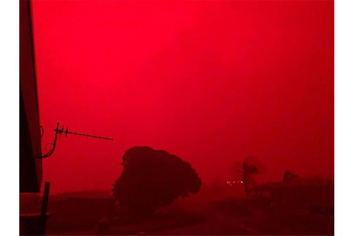 Der Himmel färbt sich rot während der Buschfeuer. In der rund 500 Kilometer östlich von Melbourne gelegenen Küstenstadt Mallacoota wurden rund 4000 Urlauber von den Behörden angewiesen, in Meeresnähe Schutz vor dem herannahenden Flammenmeer zu suchen. Foto: @brendanh_Au/TWITTER/AP/dpa