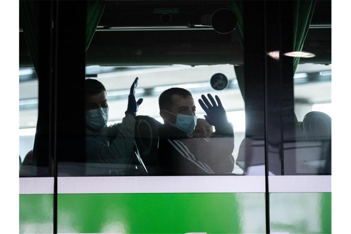 Erntehelfer sitzen mit Mundschutz in einem Bus am Terminal und winken zur Begrüßung. Foto: Fabian Strauch/dpa/Archivbild