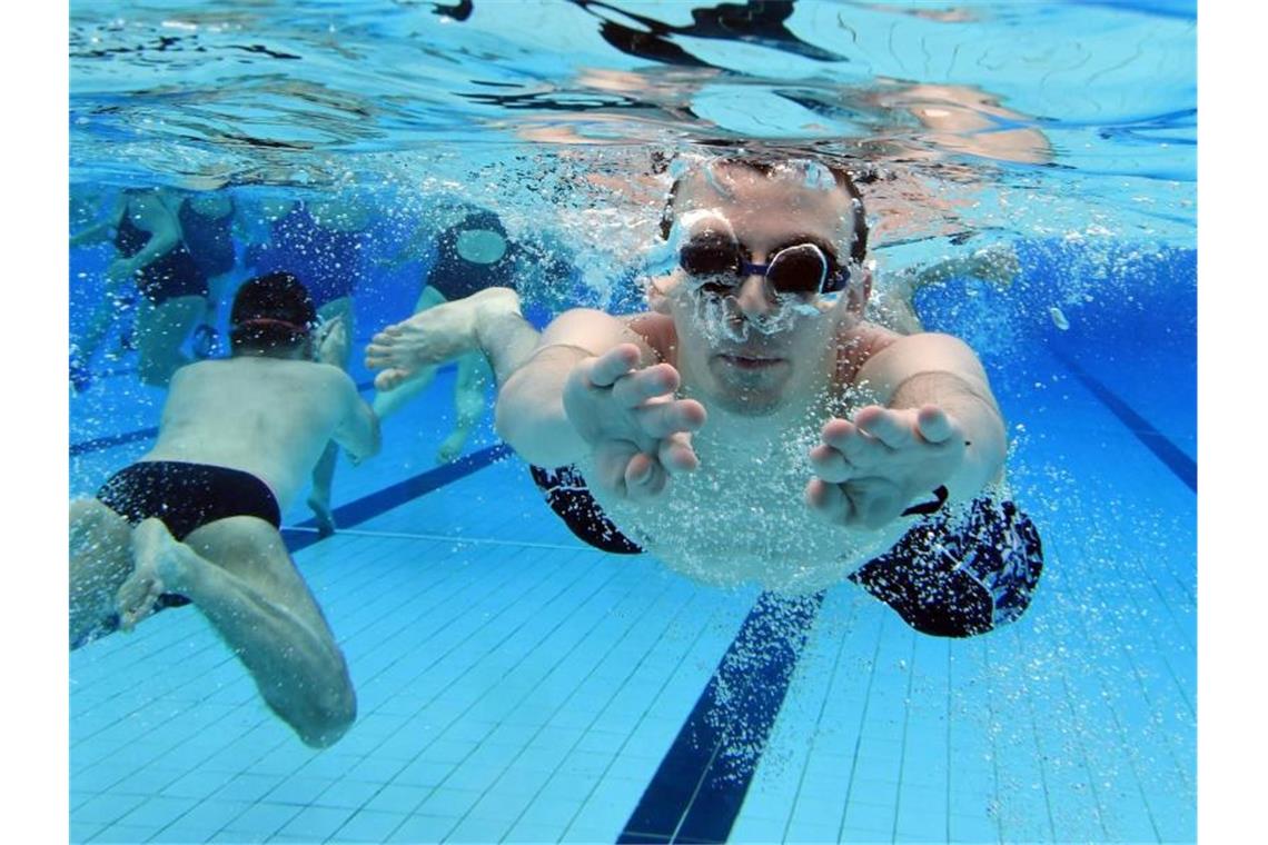 Johannes Hofschuster, Besucher des Freibad „Sonnenbad“, schwimmt zur Eröffnung des Freibads durch das Wasser des Beckens. Foto: Uli Deck/dpa/Archiv