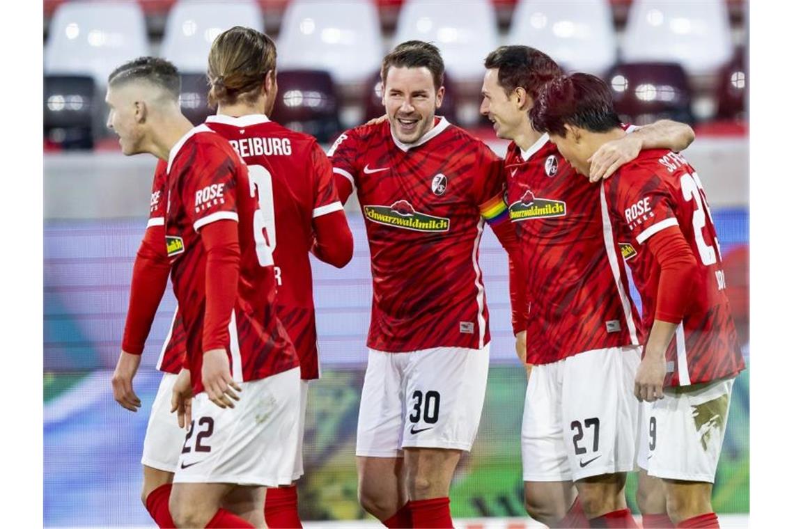 Das Team des SC Freiburg feiert einen Treffer. Foto: Tom Weller/dpa/Archivbild