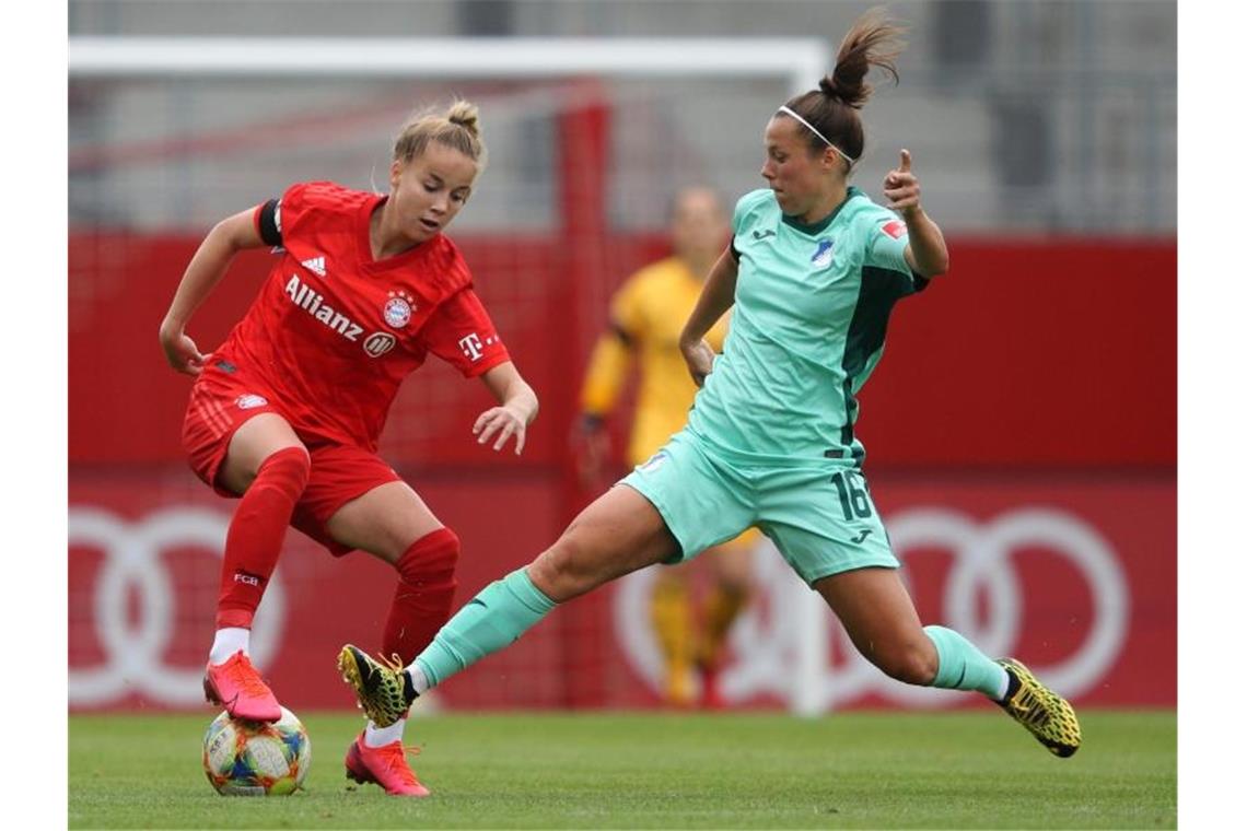 Giulia Gwinn (l) vom FC Bayern München und Nicole Billa vom TSG 1899 Hoffenheim kämpfen um den Ball. Foto: Adam Pretty/Getty Images Europe/Pool/dpa/Archivbild