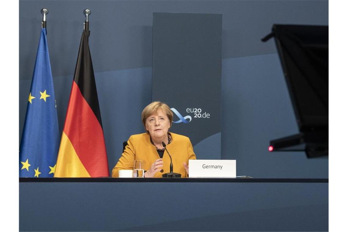 Angela Merkel, Bundeskanzlerin, nimmt im Rahmen des beim virtuellen G20-Gipfel an einer Videokonferenz im Kanzleramt teil. Foto: Guido Bergmann/Bundesregierung/dpa