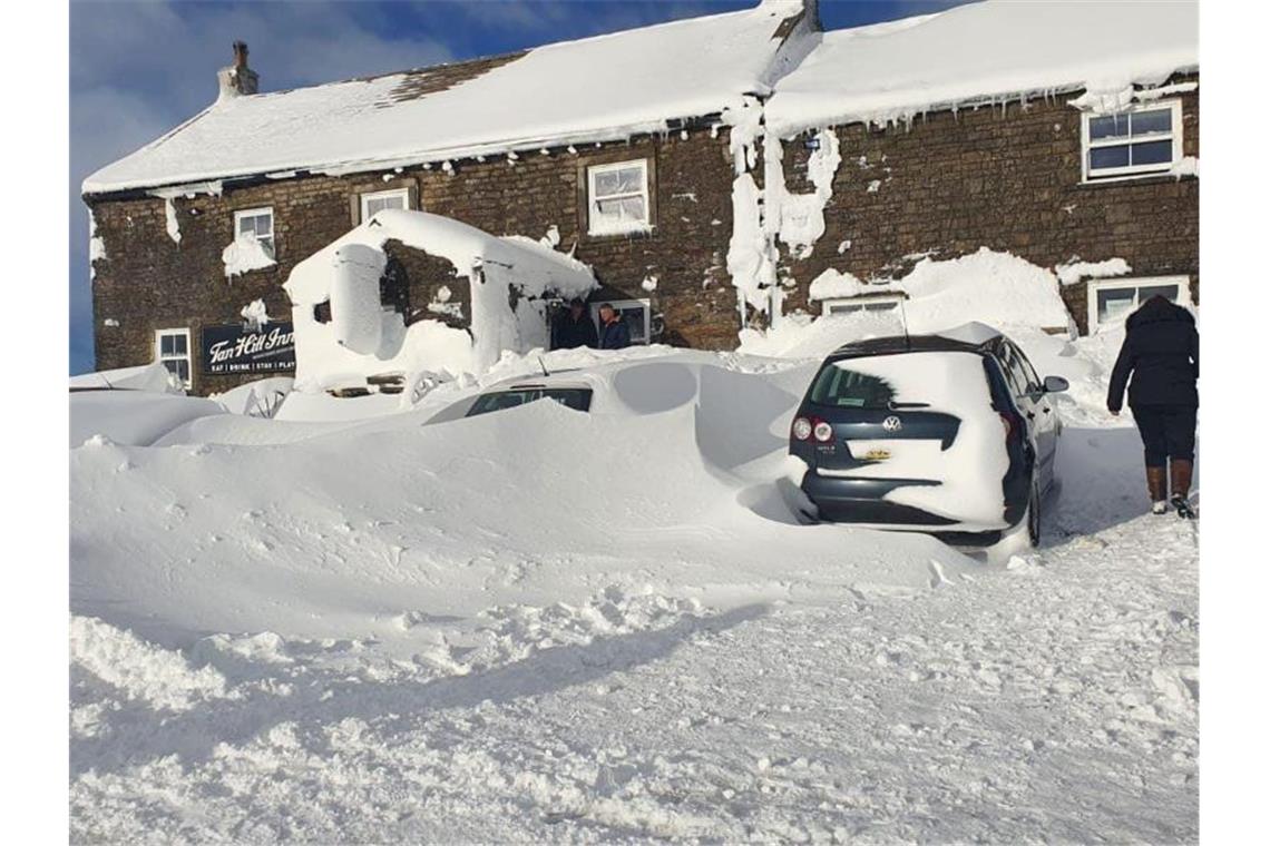 Auf Bildern war zu sehen, wie sich der Schnee um Autos und das Pub-Gebäude auftürmte. Das eigentliche Problem sei der Wind gewesen, erläuterte Townsend. Der habe den Schnee an Hindernisse geweht, darunter auch an das Gebäude und die darum herum geparkten Fahrzeuge. Die einzige reguläre Straße, die zu dem Pub führt wurde unterdessen einem Bericht des „Telegraph“ zufolge von einem umgestürzten Strommast blockiert.