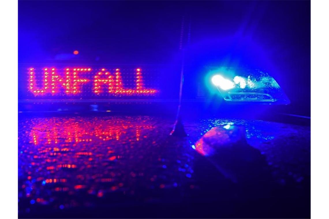 Der Schriftzug "Unfall" leuchtet zwischen zwei Blaulichtern auf dem Dach eines Polizeiwagens. Foto: Stefan Puchner/dpa/Symbolbild