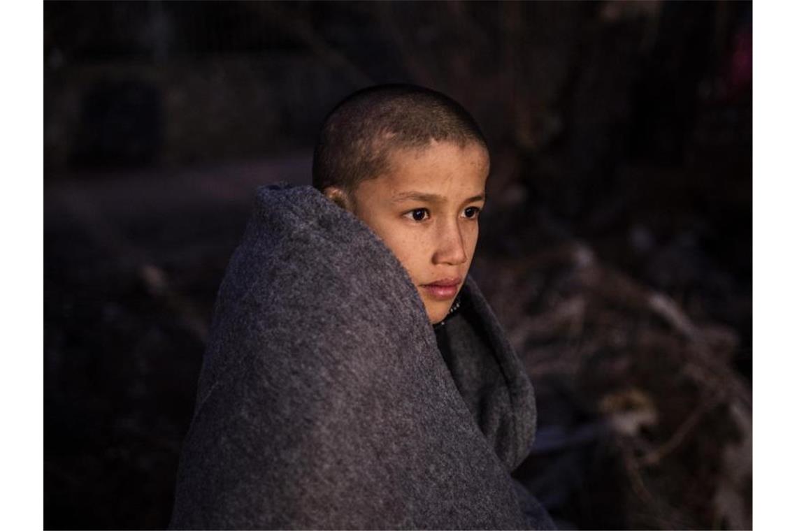 Ein Junge sitzt in Decken eingewickelt am Strand des Dorfes Skala Sikamias, nachdem er mit einem Beiboot die Ägäis von der Türkei aus überquert hat. Foto: Angelos Tzortzinis/dpa