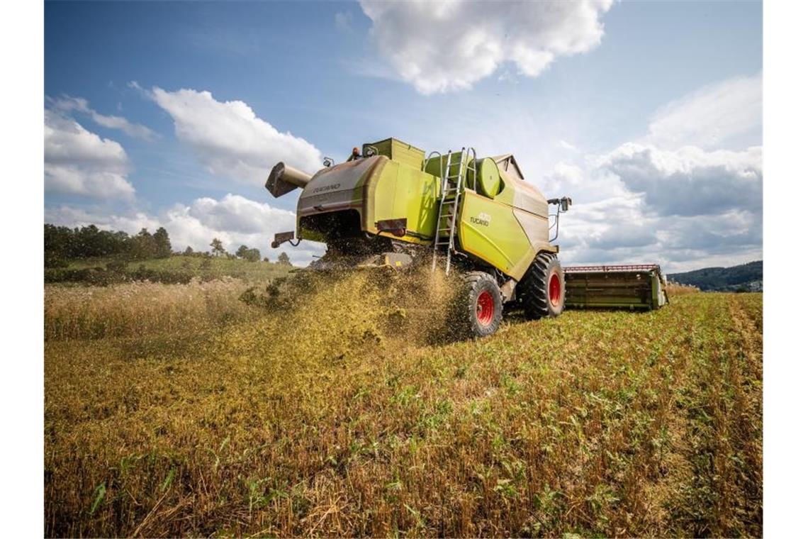 Ein Landwirt fährt bei der Getreideernte mit seinem Mähdrescher über ein Haferfeld. Foto: Christoph Schmidt/dpa