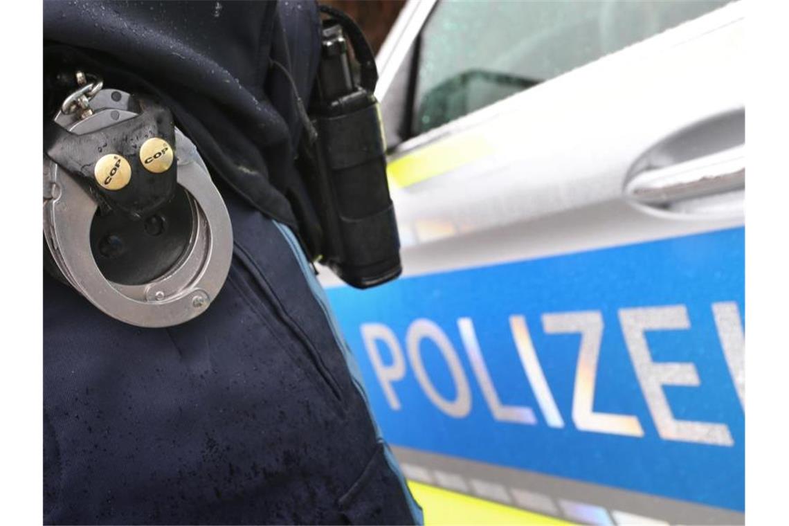 Ein Polizist mit Handschellen und einer Pistole am Gürtel steht vor einem Streifenwagen. Foto: Karl-Josef Hildenbrand/dpa/Archivbild