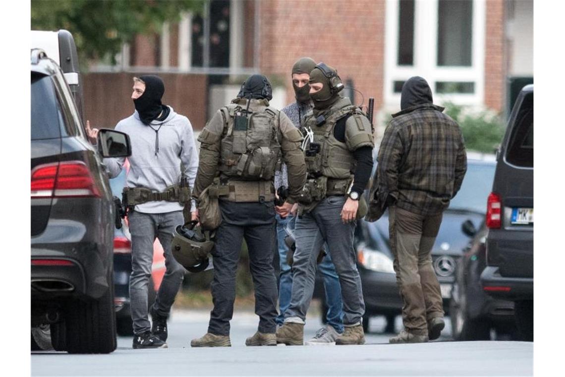 Einsatzkräfte stehen nach der beendeten Geiselnahme auf dem Gelände der JVA Münster. Foto: Bernd Thissen/dpa