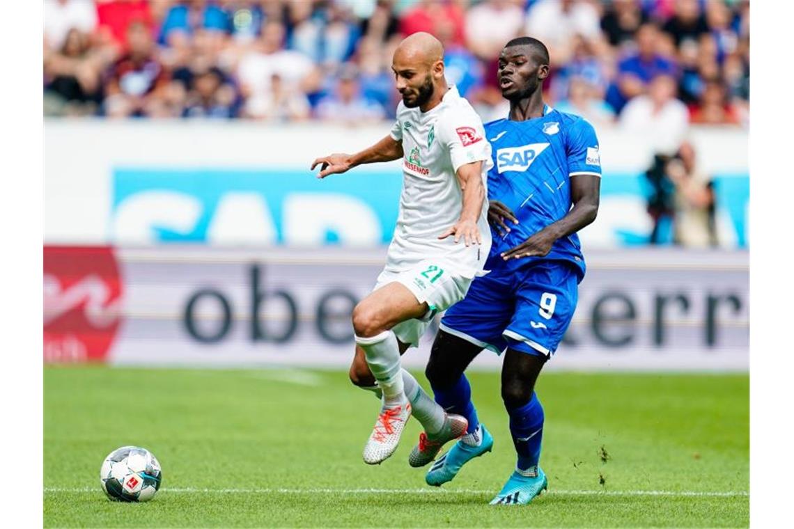 Bremens Ömer Toprak und Hoffenheims Ihlas Bebou (l-r.) im Zweikampf um den Ball. Foto: Uwe Anspach