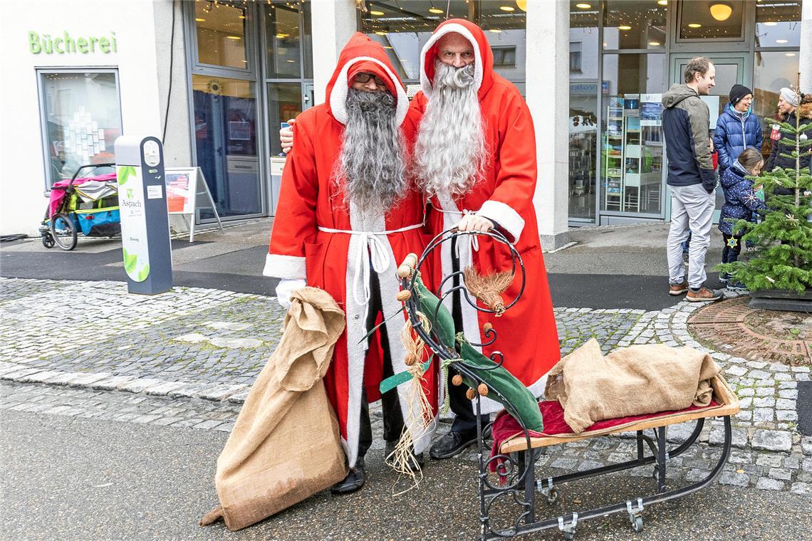 Der Weihnachtsengel (links) verteilt in Oppenweiler süße Leckereien an die kleinen Besucher.