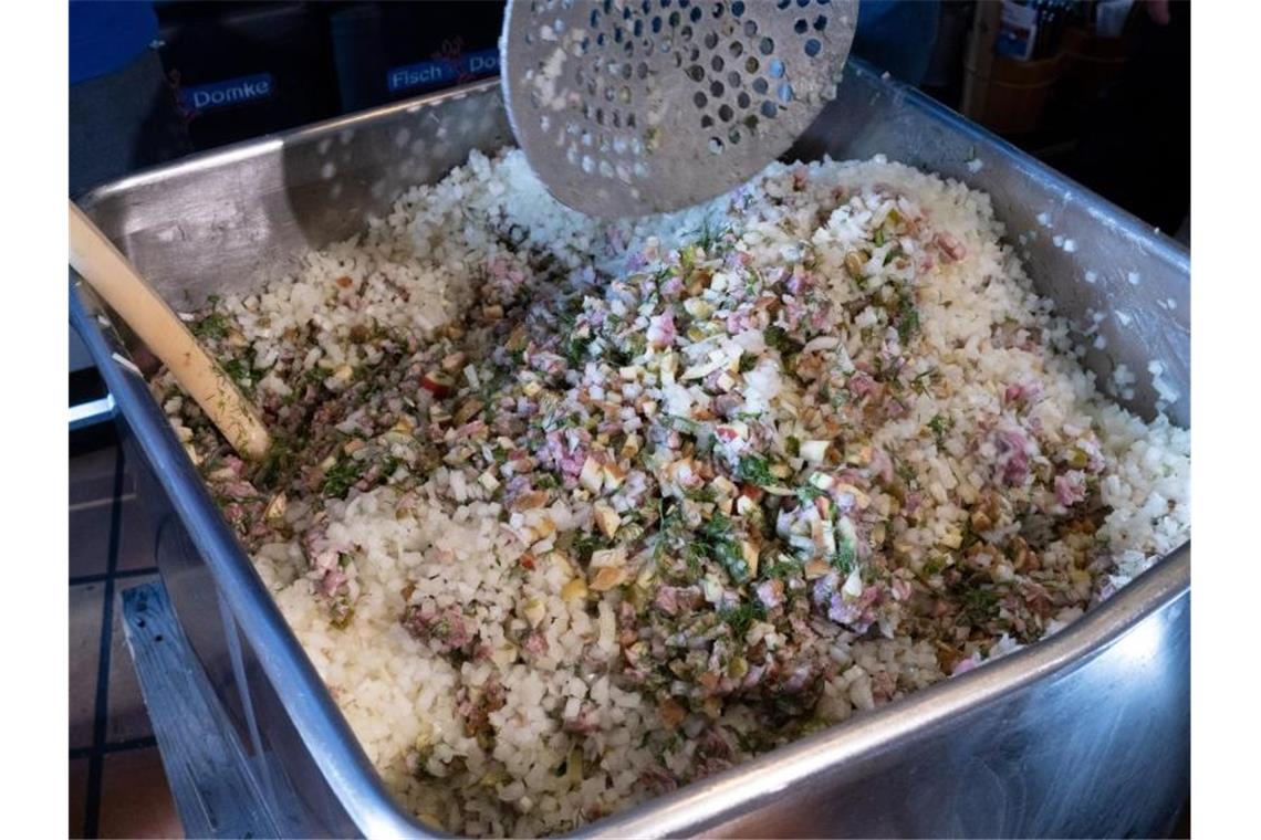 Laut Domke war zwischenzeitlich auch ein Rekord mit Labskaus angedacht. Wegen des Coronavirus sei man allerdings auf Heringshäckerle umgeschwenkt, da man die kalte Speise zur Not auch draußen servieren kann. Das Gericht bestehe unter anderem aus Matjesfilet, Äpfeln, Zwiebeln, Dill und Gewürzgurken. Es handele sich um ein typisch regionales Rezept.