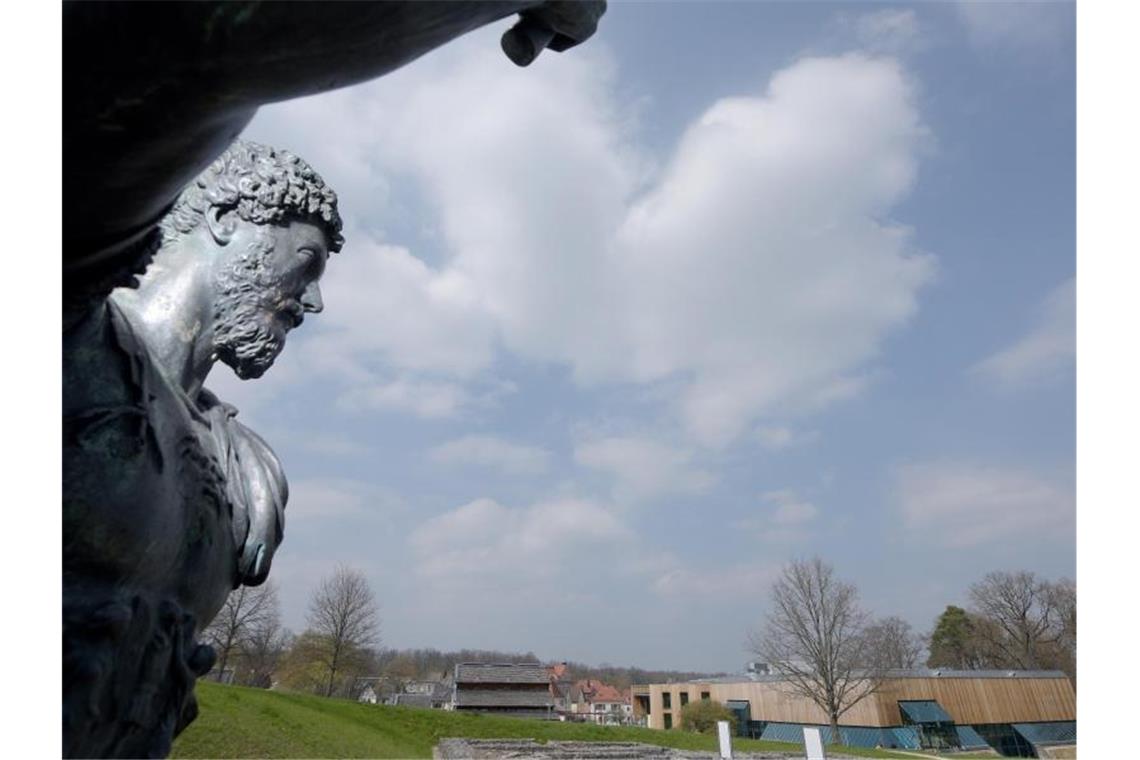Eine Statue des römischen Kaisers Marc Aurel vor dem Limesmuseum in Aalen. Foto: Stefan Puchner/Archivbild