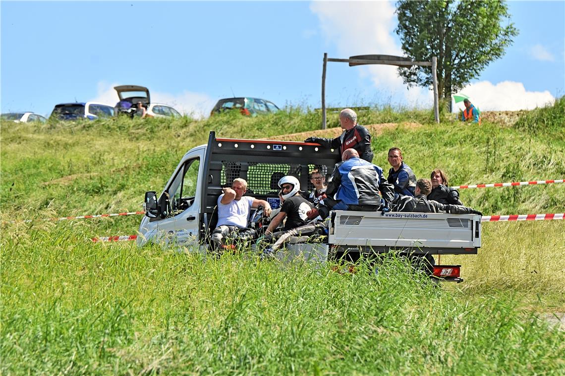 Die schweren Renncars werden samt Fahrer mit einem Shuttle zum Start hinaufbefördert.