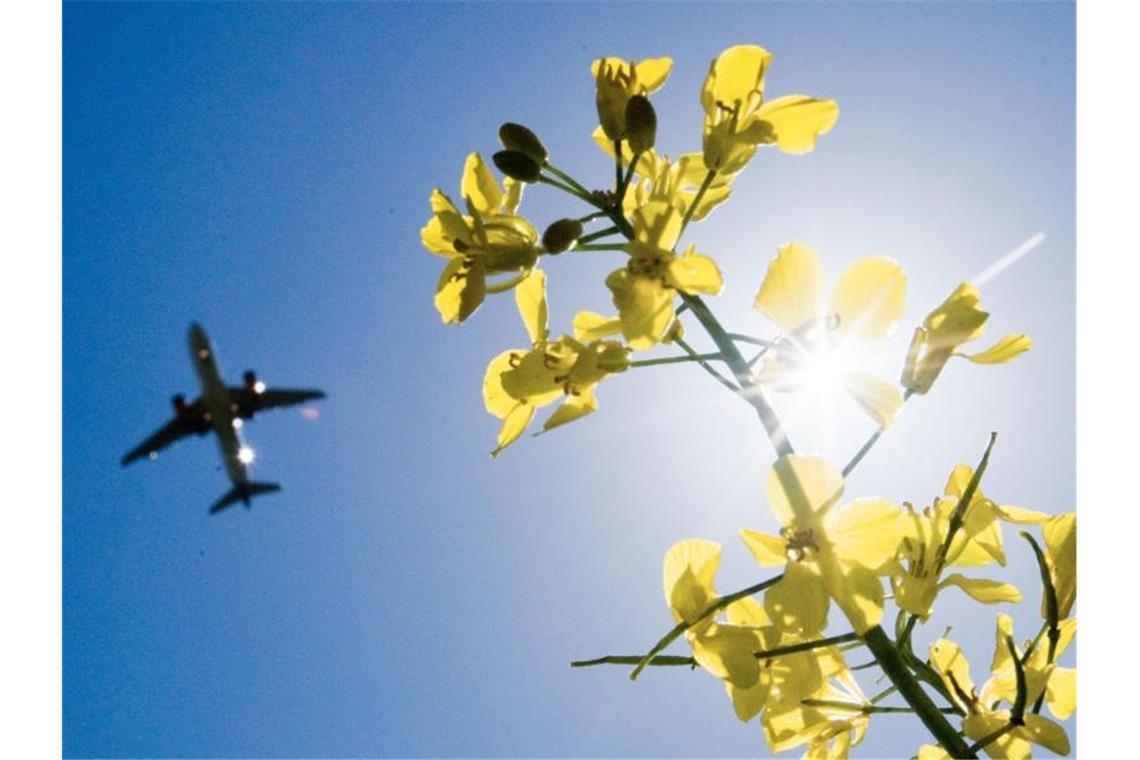 Ein Passagierflugzeug fliegt über ein Rapsfeld hinweg. Foto: Julian Stratenschulte