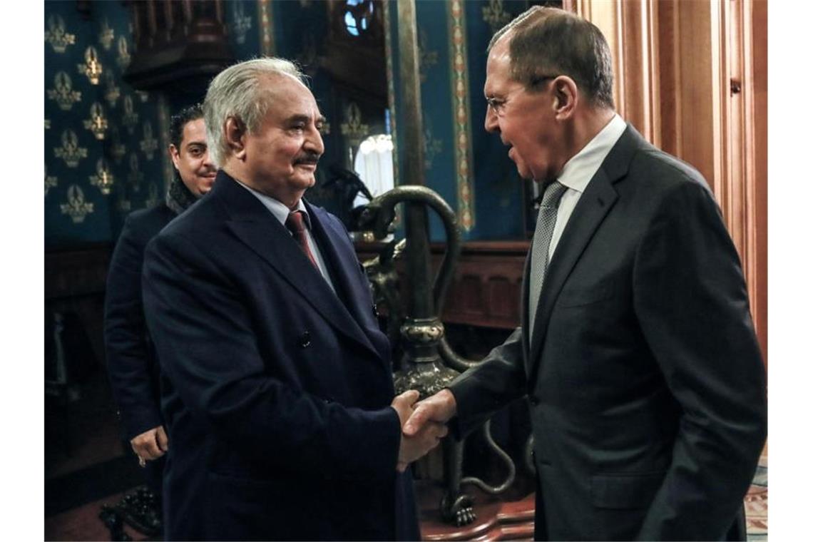 General Chalifa Haftar (l) und Russlands Außenminister Sergej Lawrow in Moskau. Foto: Russian Foreign Ministry /dpa