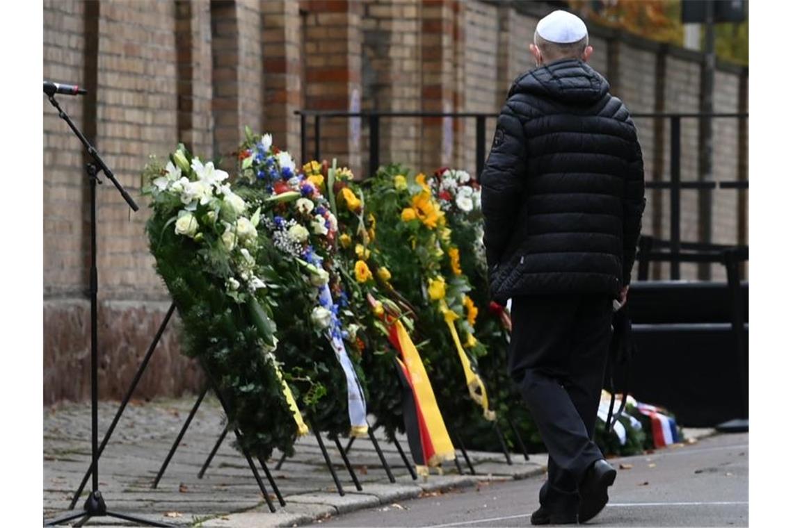 Ein Mitglied der jüdischen Gemeinde steht vor der Synagoge in Halle an Gedenkkränzen. Foto: Hendrik Schmidt/dpa-Zentralbild/dpa