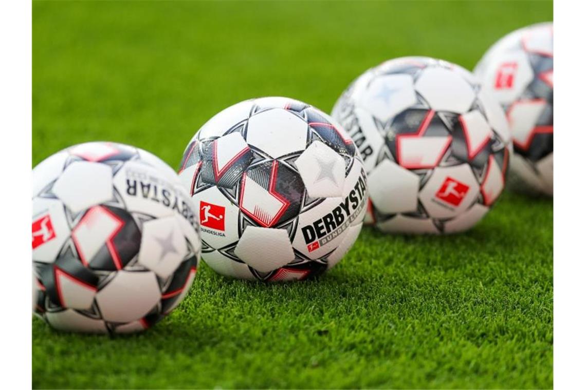 Eine Reihe von Fußbällen auf dem Rasen. Foto: Jan Woitas/zb/dpa/Symbolbild