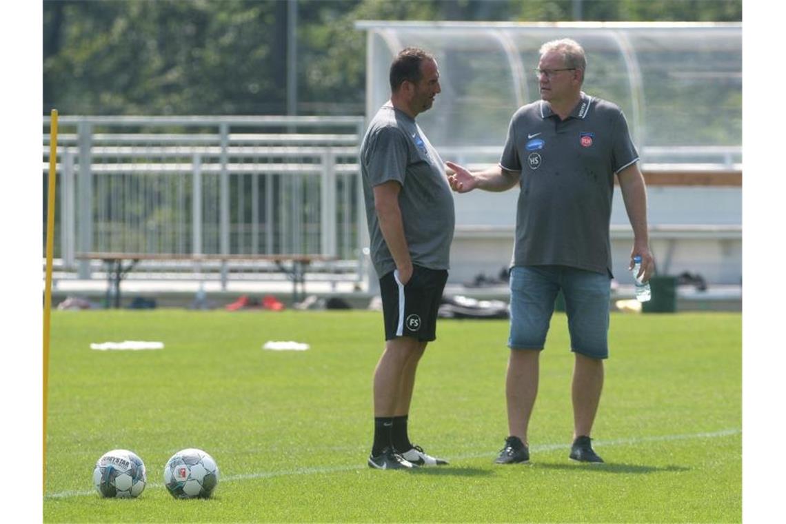 Heidenheims Trainer Frank Schmidt (l) spricht mit Geschäftsführer Holger Samwald. Foto: Stefan Puchner