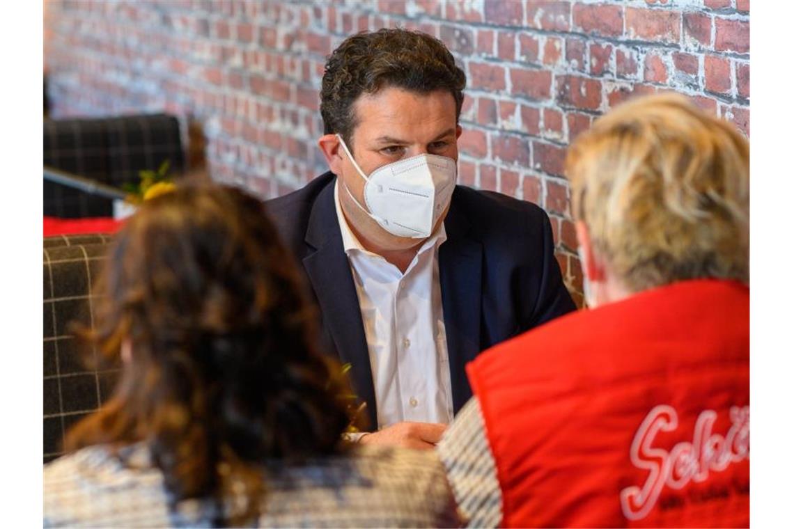 SPD-Arbeitsminister Hubertus Heil spricht in einer Bäckerei mit Mitarbeiterinnen, die vom neuen Mindestlohn profitieren könnten. Foto: Klaus-Dietmar Gabbert/dpa-Zentralbild/dpa