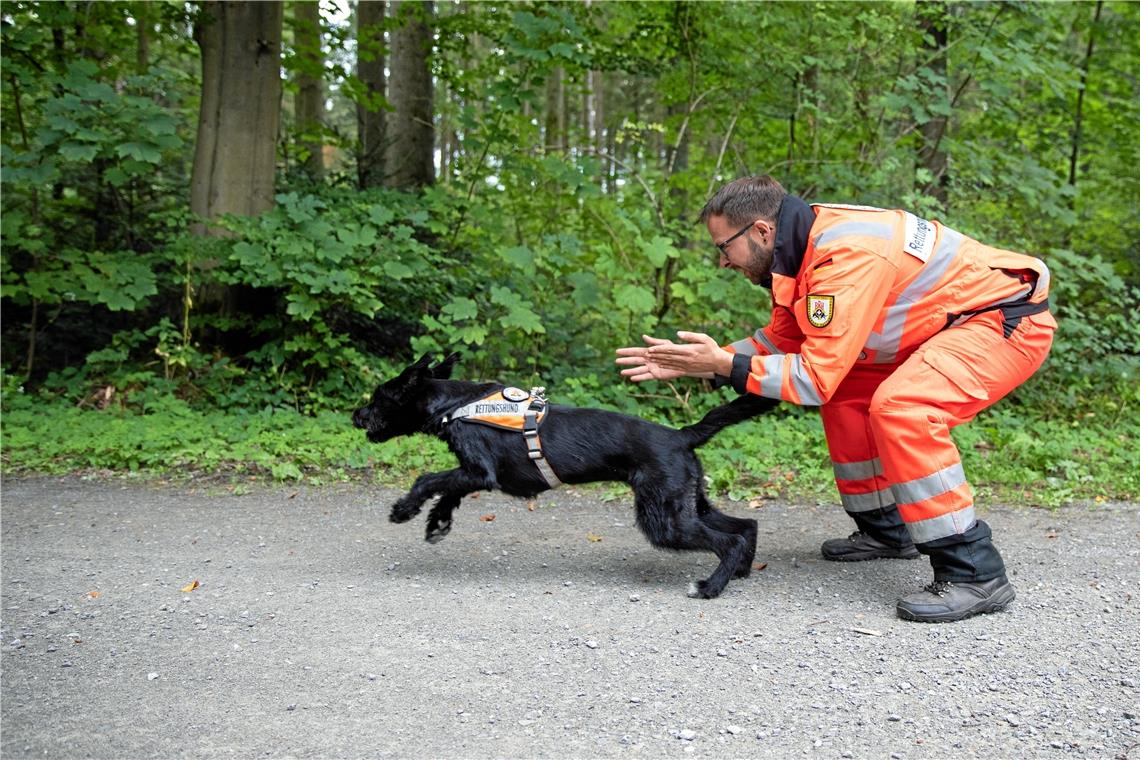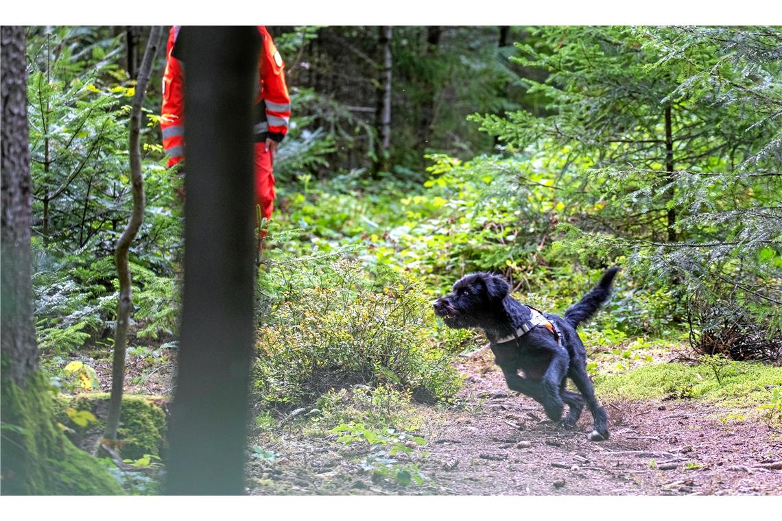 Die Rettungshundeteams trainieren in einem Waldgebiet bei Kaisersbach und sind mit Feuereifer bei der Sache