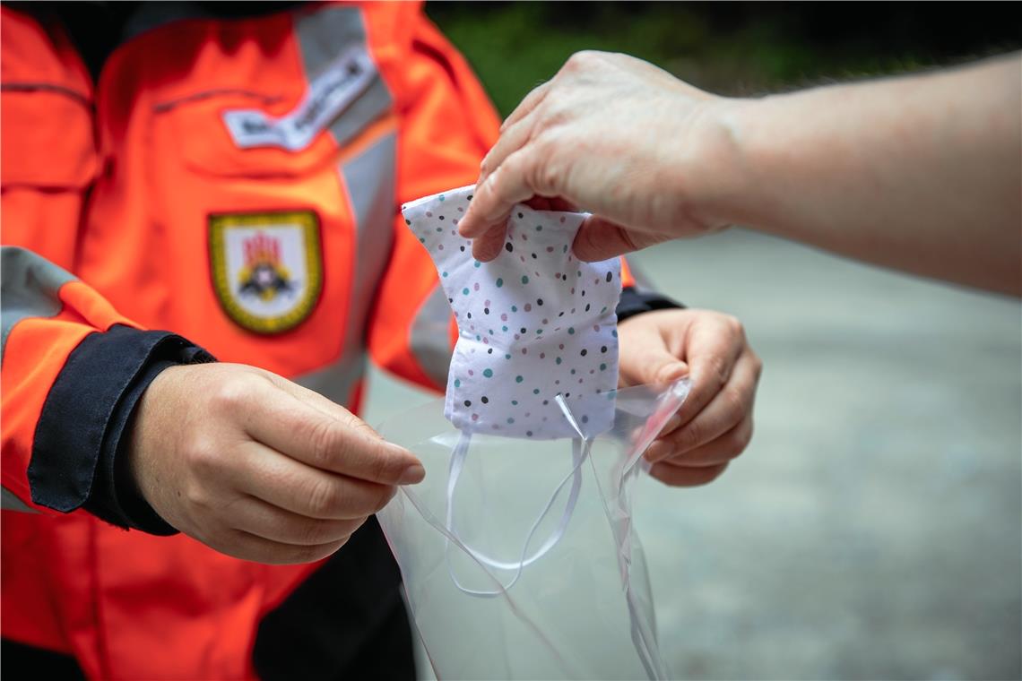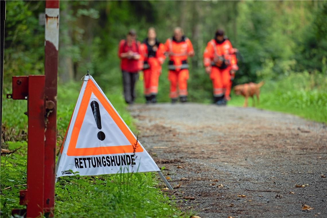 Zwei Gruppen finden sich zusammen: die Teams, die sich für die Personensuche (Mantrailing) und für die Flächensuche bereitmachen. Die Mantrailertruppe mit Katrin Reichelt, Lesley Johnson und Heike Bühler wird von Anna Skender unterstützt. Die junge Suchtrupphelferin zückt ein Taschentuch, reibt es fest an ihren Handinnenflächen und lässt es in ein Plastiktütchen gleiten, das Lesley Johnson in ihre Gürteltasche steckt. Dann macht sich Anna auf, um sich im Gelände zu verstecken – ausgestattet mit einem Sender, über den das Team sie mittels GPS-Standort und Suche im Blick behalten kann. Die Labradorhündin Ivy kommt in Arbeitskleidung – ihrem Geschirr mit der Aufschrift Rettungshund – aus dem Wagen und freut sich sichtlich.