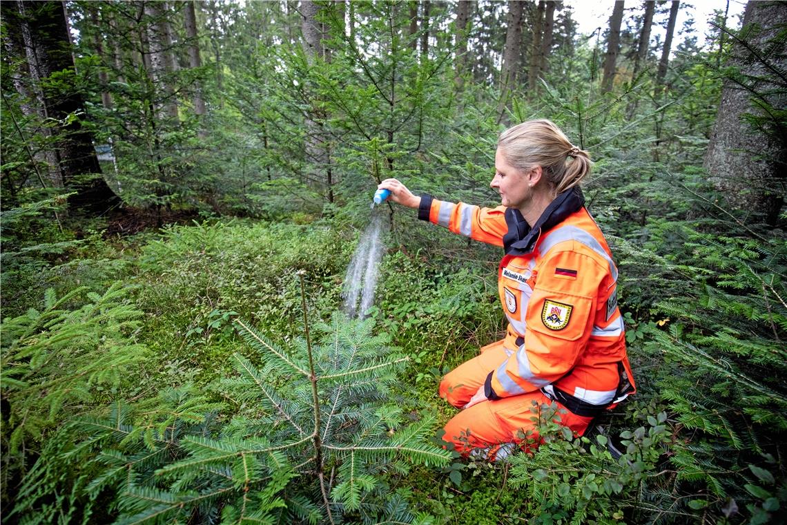 Bei der Flächensuche müssen die Teams beispielsweise die Windrichtung beachten, und die Vereinschefin zeigt mit einer kleinen Puderdose, wie sie bestimmt werden kann. Mit einzukalkulieren ist, dass die Gerüche in Windrichtung transportiert werden, damit die Suchparzellen systematisch abgearbeitet werden können. Und was ist, wenn ein Hund mit Jagdtrieb ein Reh wittert? „Die Arbeit muss hochwertiger sein“, sagt Melanie Skender.