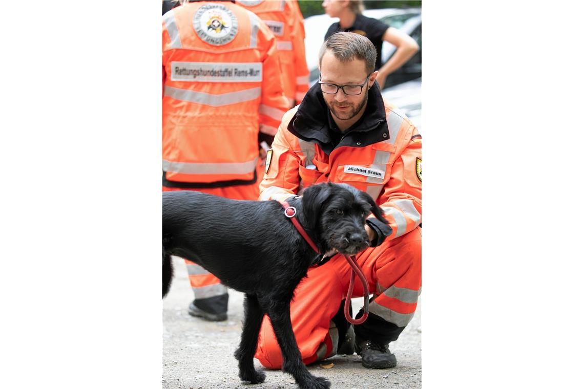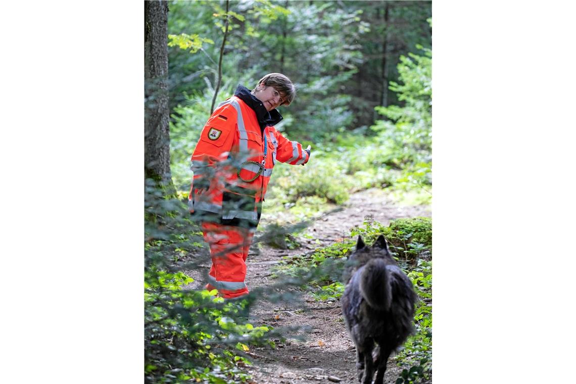 KAISERSBACH. Die Mitglieder der Rettungshundestaffel Rems-Murr trainieren regelmäßig. Damit sie und ihre Vierbeiner das auch unter realistischen Bedingungen tun können, trifft sich die Gruppe in verschiedenen Waldgebieten des Kreises, was vorher mit den Förstern abgesprochen ist. Die Sommerzeit bietet sich dafür natürlich an, allerdings gab es im August auch eine Hitzewelle mit Rekordtemperaturen. „Wir sind dann einfach ganz früh am Morgen los oder haben immer wieder Pausen gemacht“, sagt Melanie Skender, Vorsitzende der Rettungshundestaffel. Am Samstag des ersten Septemberwochenendes liegt das Trainingsterrain zwischen Kaisersbach und dem Ebnisee – und das Wetter mit rund 22 Grad ist ideal, ein bisschen schwül vielleicht. Bei der Anfahrt ist zu sehen, dass das Gebiet auch in anderer Hinsicht beliebt zu sein scheint – Pilzsammler mit Körbchen schwärmen aus, um sich auf die Suche nach Leckerbissen zu machen.