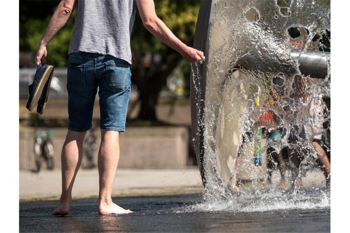 Ein Mann kühlt sich an einem Brunnen ab. Foto: Marius Becker/dpa