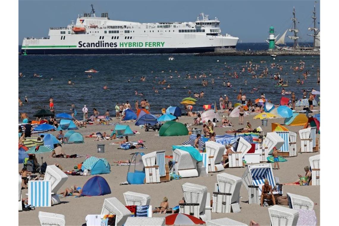 Urlauber suchen an der Ostsee in Warnemünde nach Abkühlung, während die Scandlines-Fähre "Berlin" einläuft. Foto: Bernd Wüstneck/dpa-Zentralbild/dpa