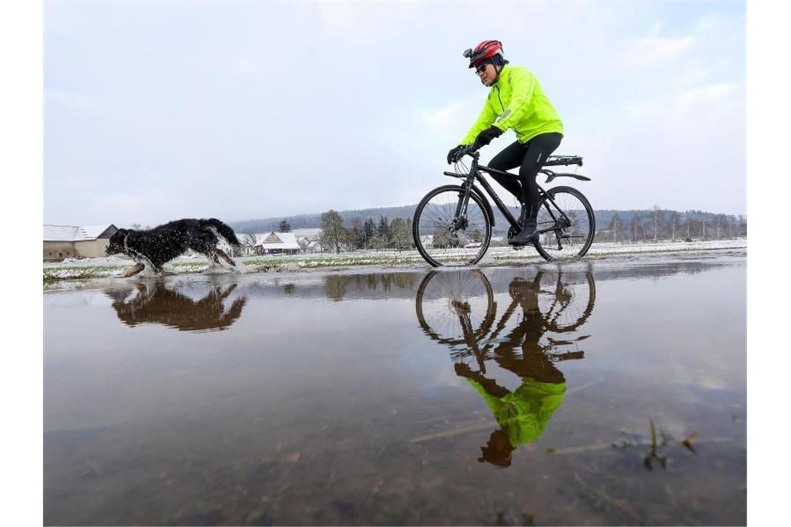Ein Radfahrer und sein Hund auf einem von Wasser überfluteten Weg nahe der Donau. Foto: Thomas Warnack/dpa