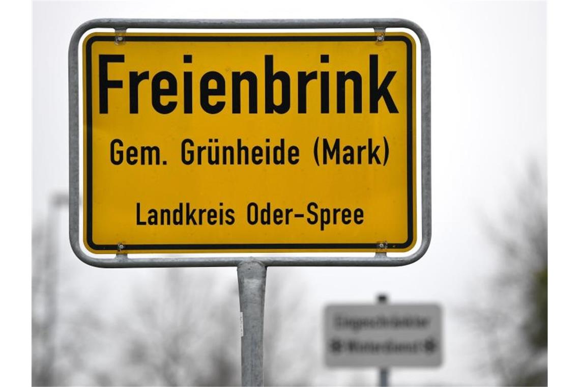 Verkehrsgünstig gelegen: Ein Schild am Rande von Freienbrink in der Gemeinde Grünheide weist auf die Zufahrt zur Autobahn 10 hin. Foto: Monika Skolimowska/dpa-Zentralbild/dpa