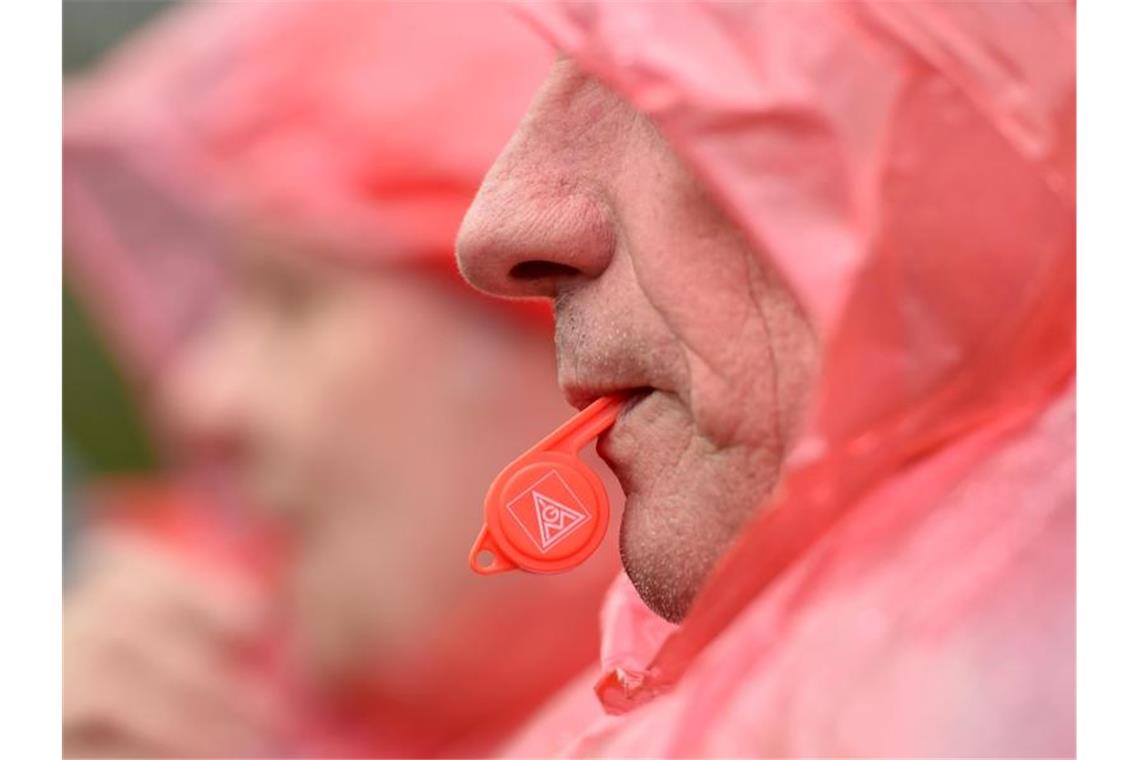 Ein Mann hat bei einer Kundgebung eine Trillerpfeife mit dem IG Metall Logo im Mund. Foto: Caroline Seidel/dpa/Archivbild
