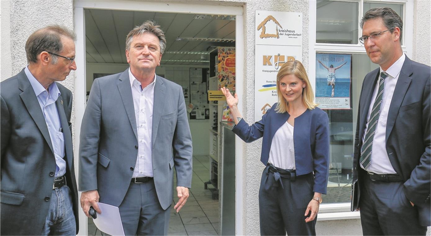 Besuch im Backnanger Kreishaus der Jugendarbeit (von links): Landtagsabgeordneter Willi Halder, Minister Manfred Lucha, Derex-Leiterin Sonja Großhans und Landrat Richard Sigel. Foto: A. Becher