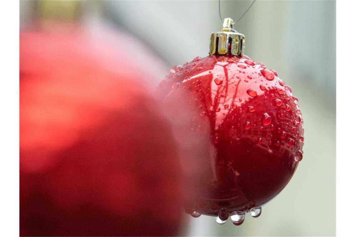 Nasse Christbaumkugeln hängen nach einem Regen an einem Baum. Foto: Sebastian Gollnow/dpa