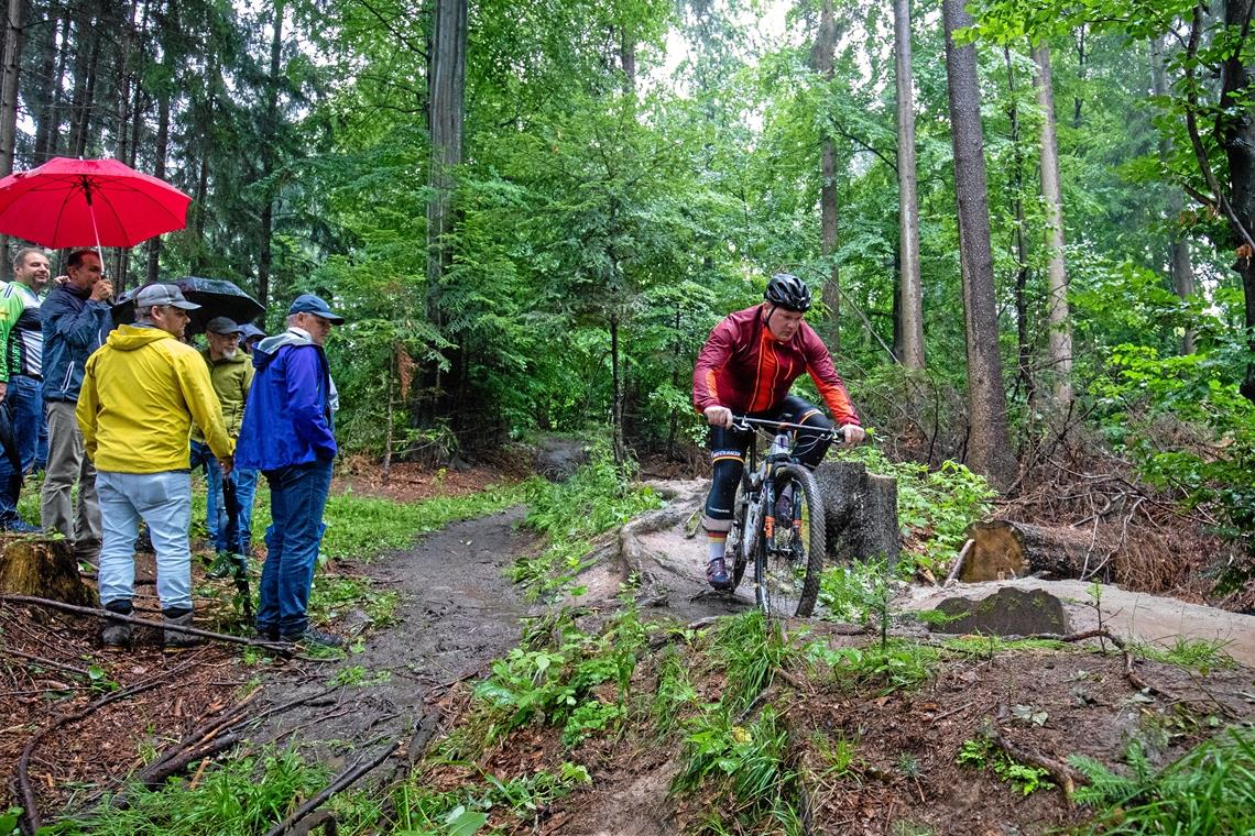 Wie aktuell die Problematik ist, zeigt sich daran, dass an dem verregneten Donnerstagnachmittag über 60 Personen zu dem Treffen mitten im Wald gekommen sind. Vor Ort sind nicht nur Mountainbiker und Spaziergänger, auch Waldbesitzer, Jäger, Vertreter des Schwäbischen Albvereins und vom Naturpark Schwäbisch-Fränkischer Wald. Der Ort für das Treffen im Wald zwischen Oppenweiler und Steinbach wurde nicht grundlos gewählt: An genau dieser Stelle kommen nämlich die Interessen der vielen verschiedenen Gruppen zusammen. Staatswald grenzt an Privatwald, dort verläuft ein beliebter Wanderweg, der auch von Mountainbikern viel genutzt wird und auf dem Weg gibt es eine Schanze, die manche Mountainbiker gerne für Sprünge nutzen, an der aber auch schon schwere Unfälle passiert sind.