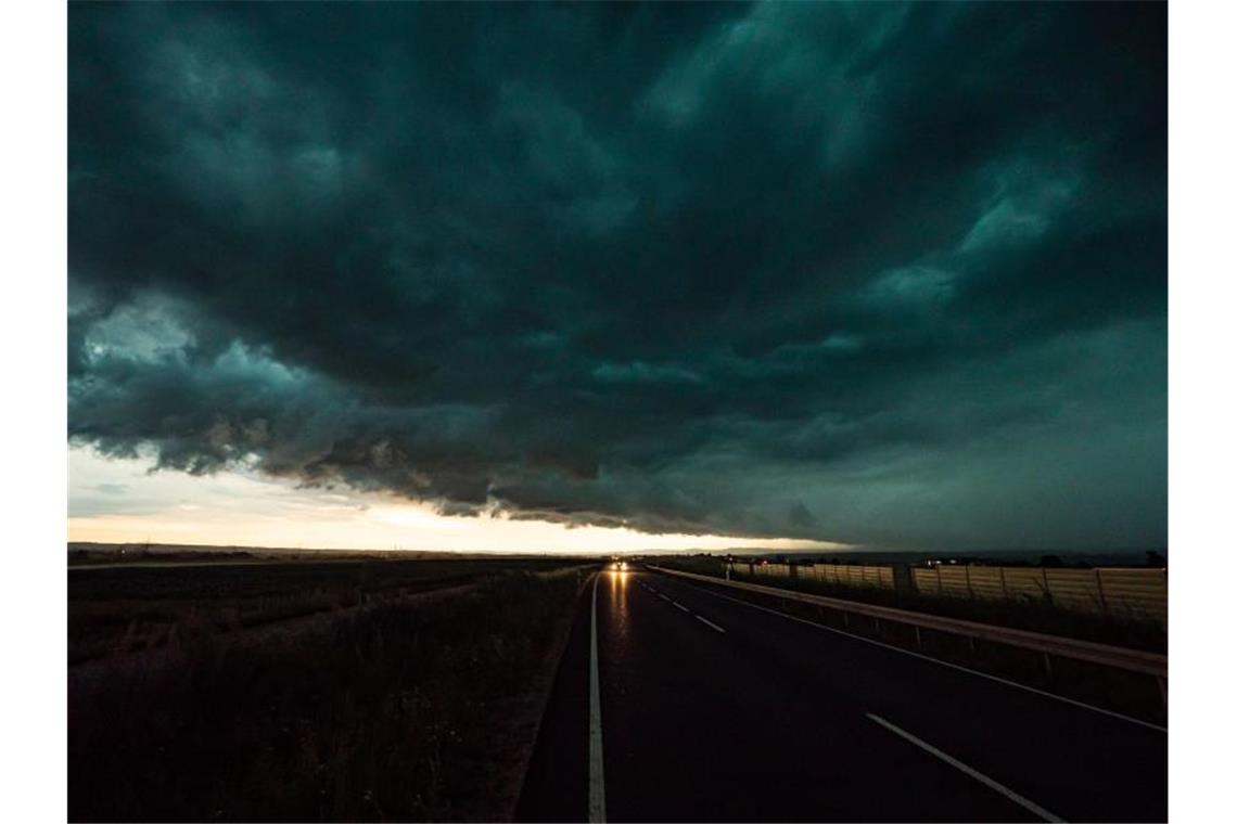 Ein massives Unwetter mit einer sogenannten Shelf Cloud zieht über die A8 bei Esslingen und Stuttgart. Foto: Alexander Hald/vmd-images/dpa